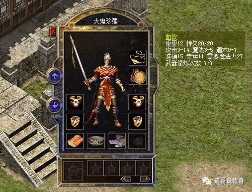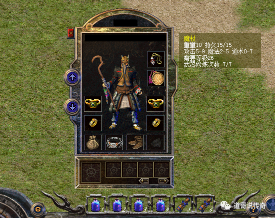 3、魔杖:攻击5-9,魔法2-5,道术0-7魔杖好歹是沃玛级别的兵器,在复古版本中也算是比较高端了,但是上图中的魔杖在升级的时候也是和法师职业对着干的,因为它升级了7点道术属性不知道是升级的人太土豪随便玩玩,还是道士玩家想伪装成法师扮猪吃老虎,总之这把道7魔杖让法师玩家看了都要崩溃。