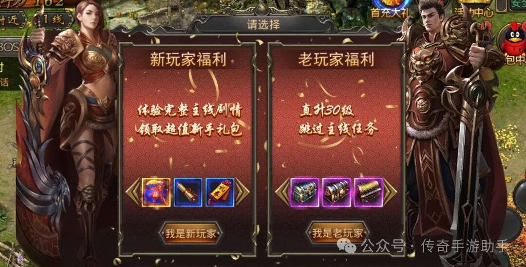 接下来进入正题:快速提升等级 起号最重要的就是等级,等级越高,血量和防御越高,装备可以穿的越好,技能可以学的越多,任务激活的越多,一些地图的门槛也是等级的限制 首先新区创建角色后,选择“我是老玩家”直升30级,直接跳过最无聊浪费时间的新手主线任务,附送一套新手装备。