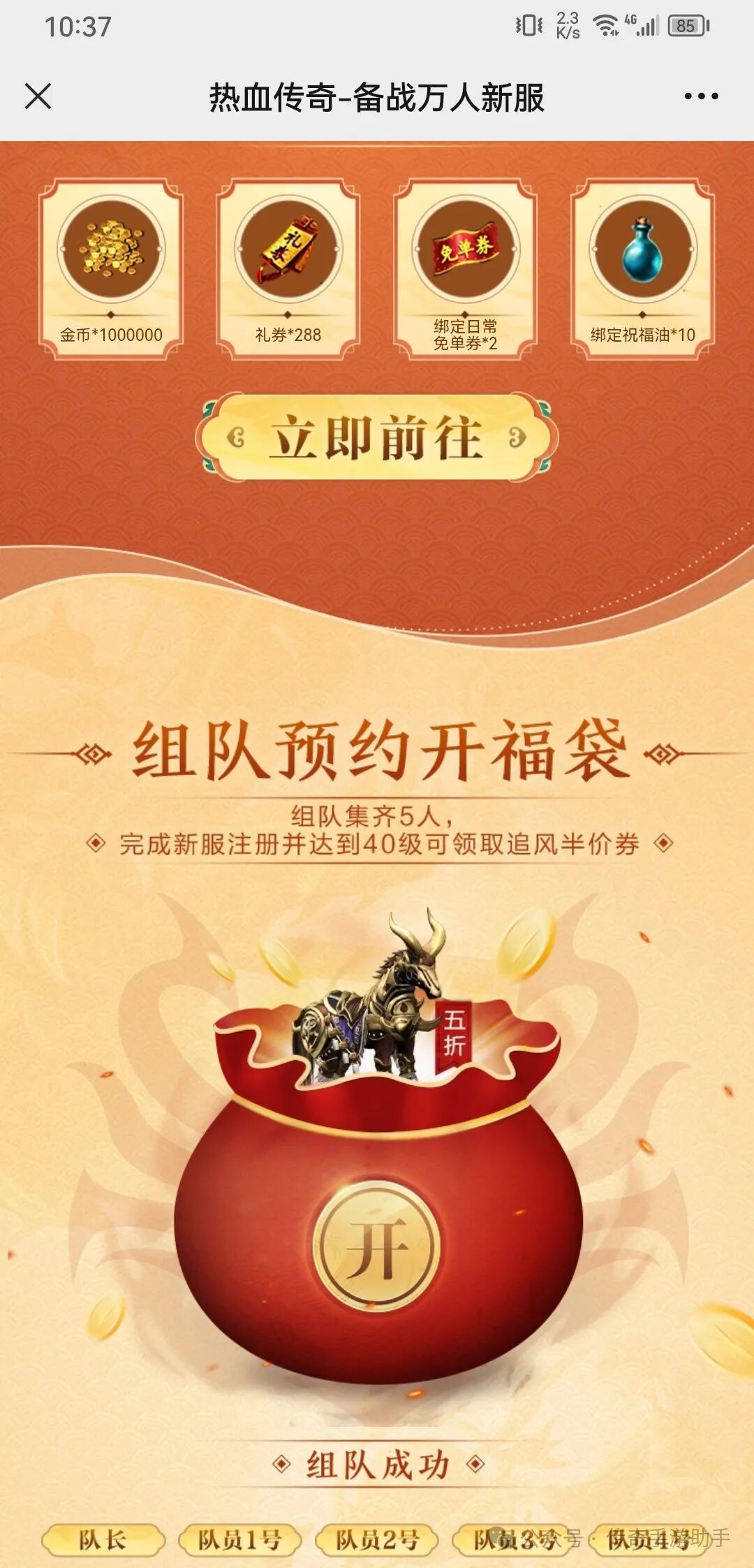一般新区还会有备战新服预约通道,组队领奖等活动