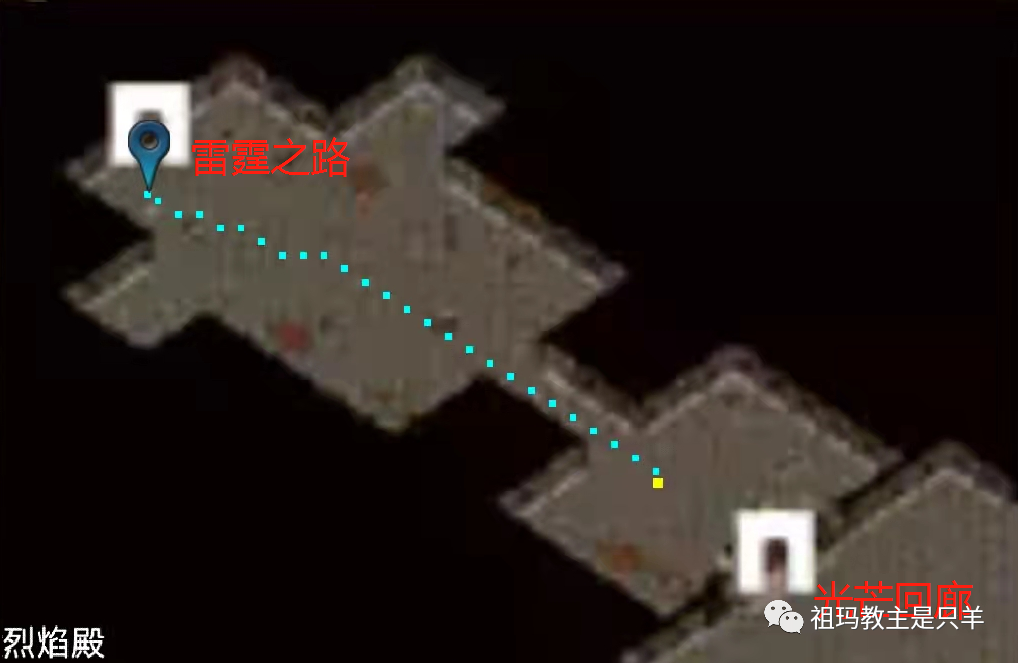 烈焰殿雷霆之路 雷霆之路里面也刷若干白野猪,可使用随机(见下图),自上往下为四个岔路,第二条通往【霸者大厅】,其余均通往【秘密通道Ⅰ】;秘密通道Ⅰ中刷新白猪和猪卫,在右上角确实有个出口的台阶,但是真正走过去才发现是没用的。