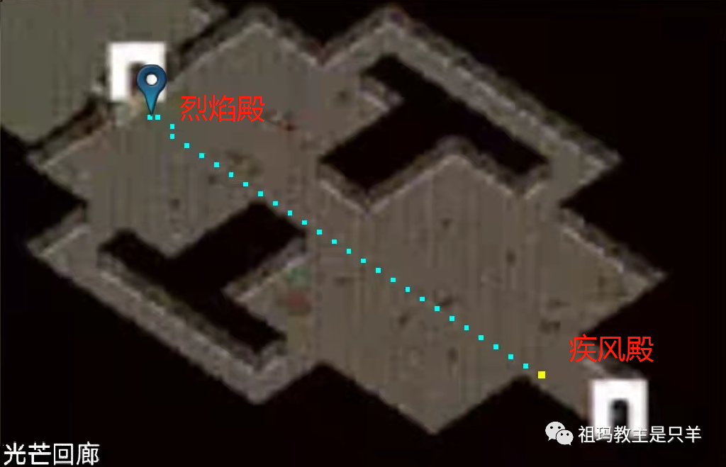 疾风殿光芒回廊 光芒回廊里会额外刷500血的极品红黑小猪,可使用随机,尽头通往【烈焰殿】(见下图)