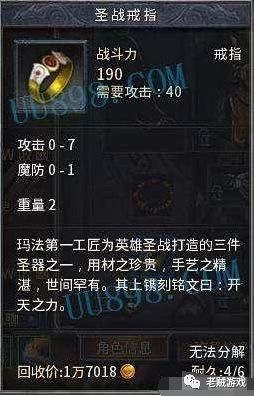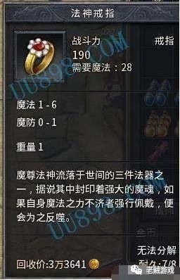 法神戒指的描述不错其他人也表示挖出了一瓶祝福油,也不错了,当时一瓶祝福油价值几十万呢!这种小东西比如沃玛装备,谁捡到就是谁的,不用分红大伙儿都乐的在那里讨论装备的价格,当时的圣战套,因为刚出来,基本是乱喊,最后圣战戒指被九月鹰飞以1200的价格收购,头盔800,手镯1200,因为当时都传说圣战套装是有隐藏套装属性的,虽然后来都知道纯属扯淡,但是当时整个区里面包括我们几个,都是深信不疑,九月出这个价格也不算亏,因为这个价格一直稳定在6000一套左右。