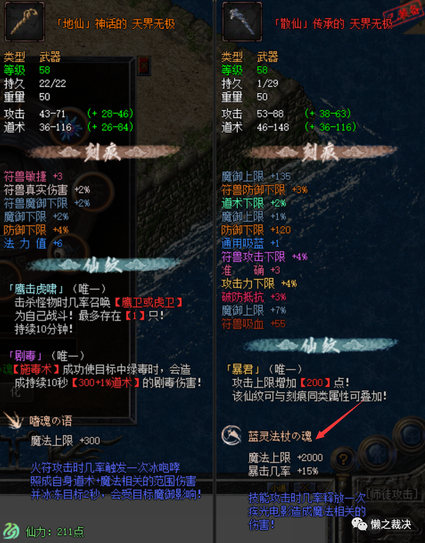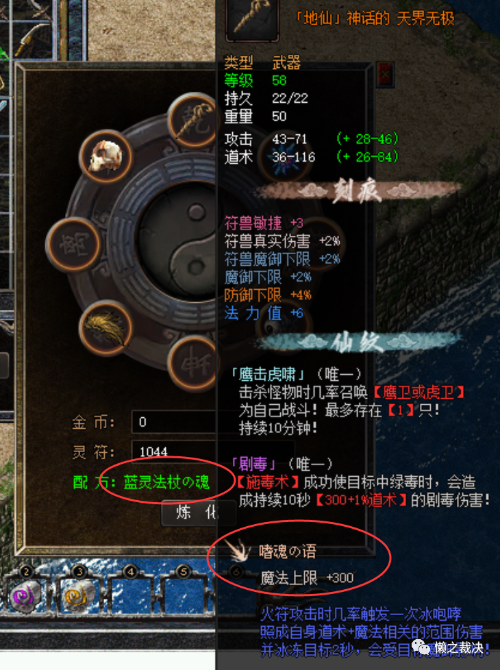 首先是【蓝灵法杖の魂】的附魔,使用配方前,需要注意,该武器必须要已经附魔了【嗜魂の语】才行,不然是无法激活配方的!配方如下👇已附魂【嗜魂の语】的武器 ——乾位神の树根(封魔城-万年树妖爆) ——震位尸皇の颅(矿洞-尸皇爆) ——兑位