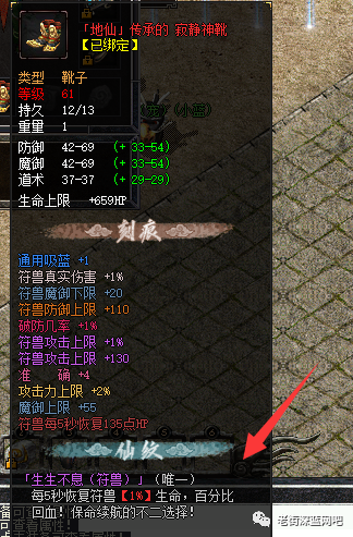 这里需要提到的是前期符兽基本都是近战型,所以没升级到远程符兽前最重要的就是站桩能力,在装备的选择上,前期防御回复型的比攻击类的性价比高,生生不息这个仙纹就非常好用,符兽每5秒百分比回血【1-15%】,存活率直线上升!我这件装备才1%属实有点脸黑啊!