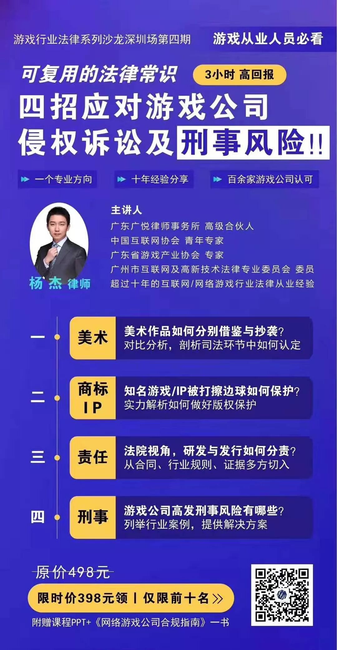 《“游”法可依》是手游那点事与广东广悦互联网与高新科技杨杰律师团队联合推出的游戏相关法律知识栏目,该栏目会列举当下游戏市场中最受关注的法律纠纷案例,由杨杰律师团队中的资深律师进行法律层面上的解读10月25日14:30,杨杰律师将在深圳带来线下课程《游戏美术作品/商标IP生存“法”则&游戏公司刑事风险防范指南》,详情可见文末。