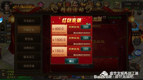以上就是获得装备的一些途径自己不需要的装备可以直接回收获得经验 ,也可以丢到公会仓库,获得贡献同时也可以在仓库里边找到自己需要的装备简单讲下开服一些充值小福利抢红包了也比较划算的(土豪请无视)当天单笔充值500送150,1000送400,3000送1500这些红包不使用过了零点就清除了。