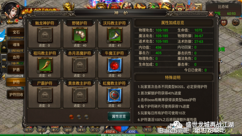 打boss主要让战神抗boss伤害 人物走位输出。其次就是野外boss,这个比较简单随便就杀了,杀野外boss可以获得护符在神炉里边增加战斗力。