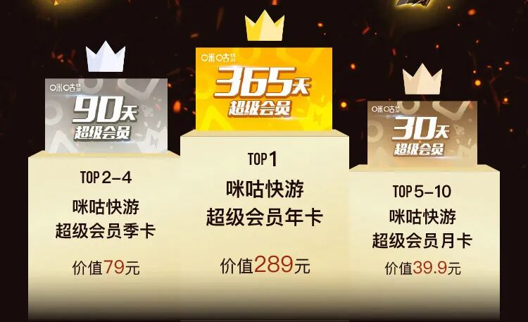 TOP 1咪咕快游超级会员年卡 TOP 2- TOP 4咪咕快游超级会员季卡 TOP 5- TOP 10咪咕快游超级会员月卡—— 快游会员权益——