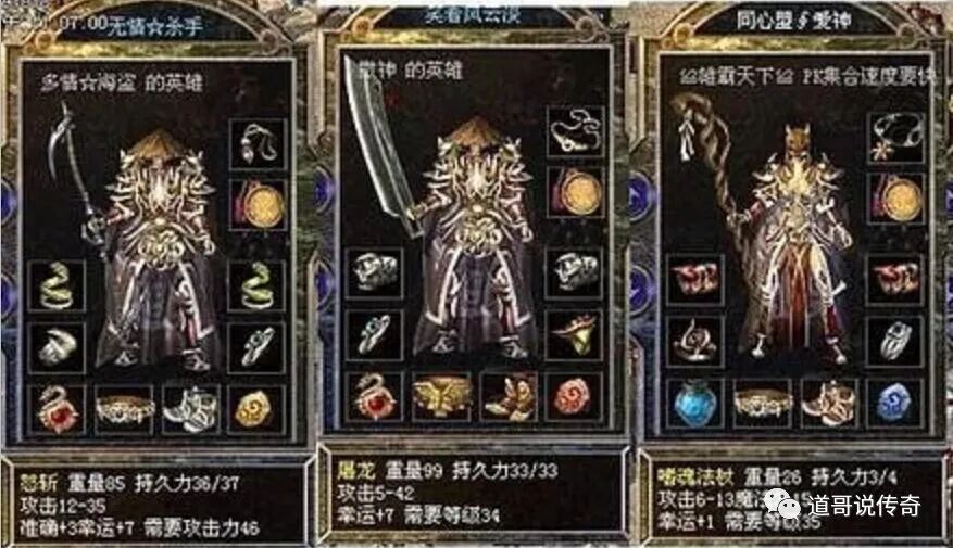 第二点:武器贬值传奇版本在不断更新的过程中也出现了很多全新的高端神兵,那些曾经遥不可及的神兵逐渐也就贬值成为大众化武器了在这样的情况下大家就可以放心拿着这些贬值武器去升级了,如果升级成功就能成为超越全新神兵的高端武器,如上图所示,这三把超级神兵都是经过升级之后才有更高端的价值。