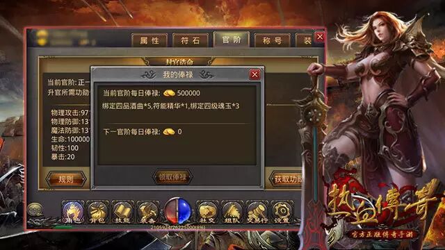 官阶系统功勋可转荣耀值助攻城掠地《热血传奇手机版》官阶系统即将登场,全方位满足玩家的从官需求九阶官职划分,做功勋任务加官进爵,获得可观的属性加成与每日俸禄每周功勋榜获得者还将获得荣誉爵位称号此外,功勋值超过300以上的部分将转化为全服荣耀值参与激烈的攻城掠地跨服战,战后荣誉值越高,战功奖励越好!游戏还将根据最终荣耀值确定本周本服奖励池的档次,按照玩家们对应的官衔进行统帅奖励和战功奖励发放!。