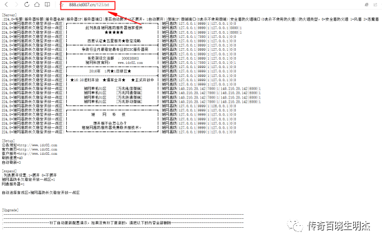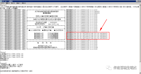 5.打开我们创建的TXT文本,修改里面的ip:127.0.0.1是单机地址,我们需要把他修改成我们的服务器ip地址,7000端口是服务器连接对应ip,后面的8000是所对应的微端端口,我们修改的话就是找到对应的区ip相对的修改即可,
