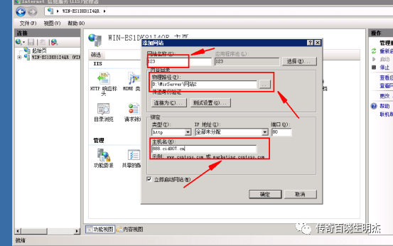 2.开始填写网站信息,网站名称我们可以随便填,物理路径我们选择我们网站所在文件夹路径即可,主机名填写自己的备案域名,填写完成后点击确认即可(如果没有域名就需要IP加端口的方式来进行搭建端口也只能使用80