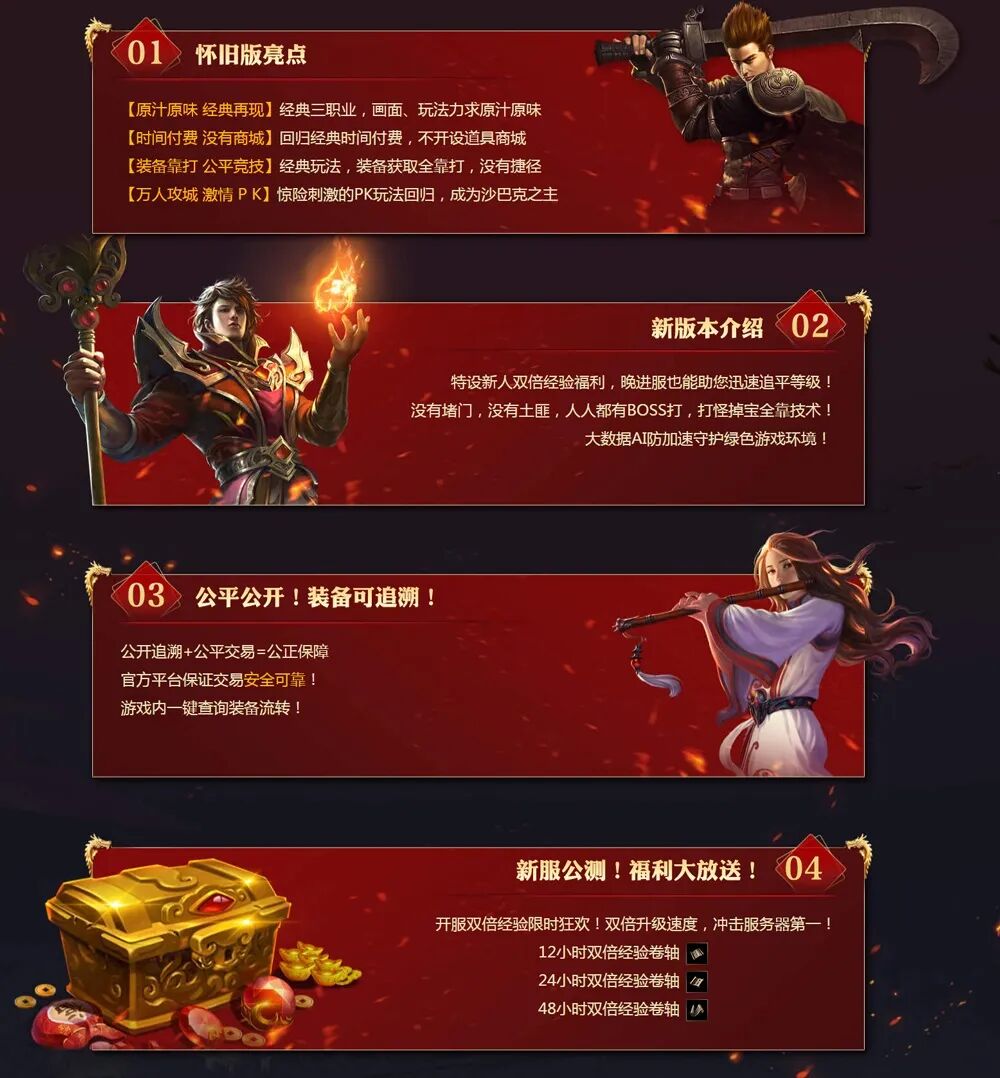 温馨提示1、预约玩家可以获得2小时免费时间,可以在开服之前立即创建角色2、如果玩家没有预约,那么需要充值游戏时间后才能进新区创建角色02怀旧回归 老兵畅玩回馈传奇系列老玩家二十余年来一如既往的支持,我们推出老玩家回归活动:
