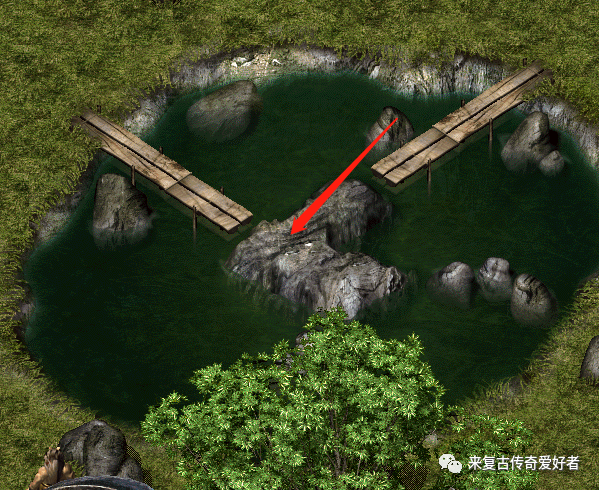 从池塘中间进入(坐标428,474)。
