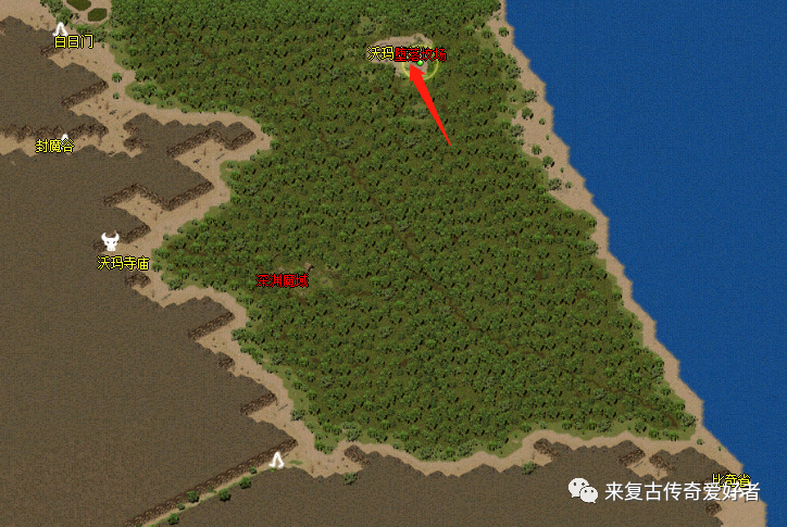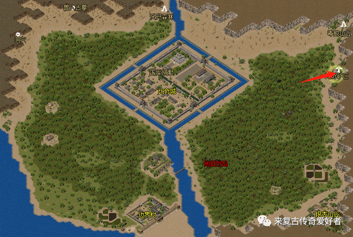 二、尸王殿地图走法介绍1、先到比奇省,再跑到废矿区(坐标 664:213);