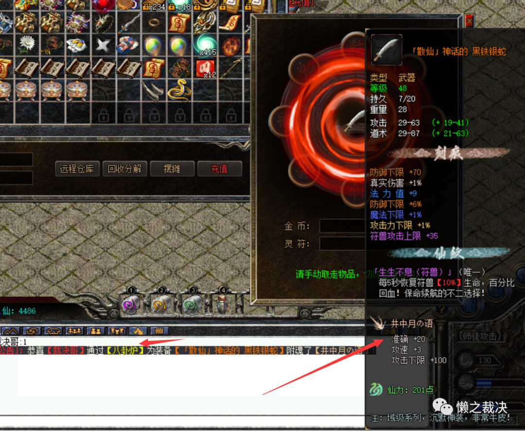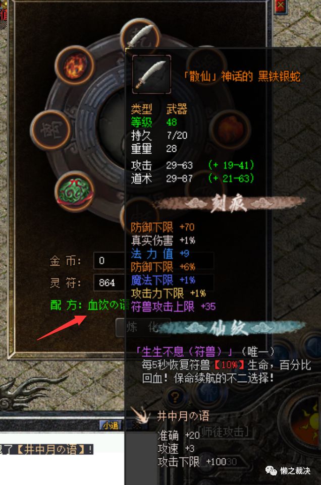 可以看到合成后【黑铁银蛇】的外观变成了【井中月】但是装备还是原来的装备,注意看名称和属性~附魔后附加了井中月的特殊属性对于战士路线来说,中规中矩~准确20可以让你前期可以省点技能消耗~攻速+3可以在配合仙纹也是不错的提升~