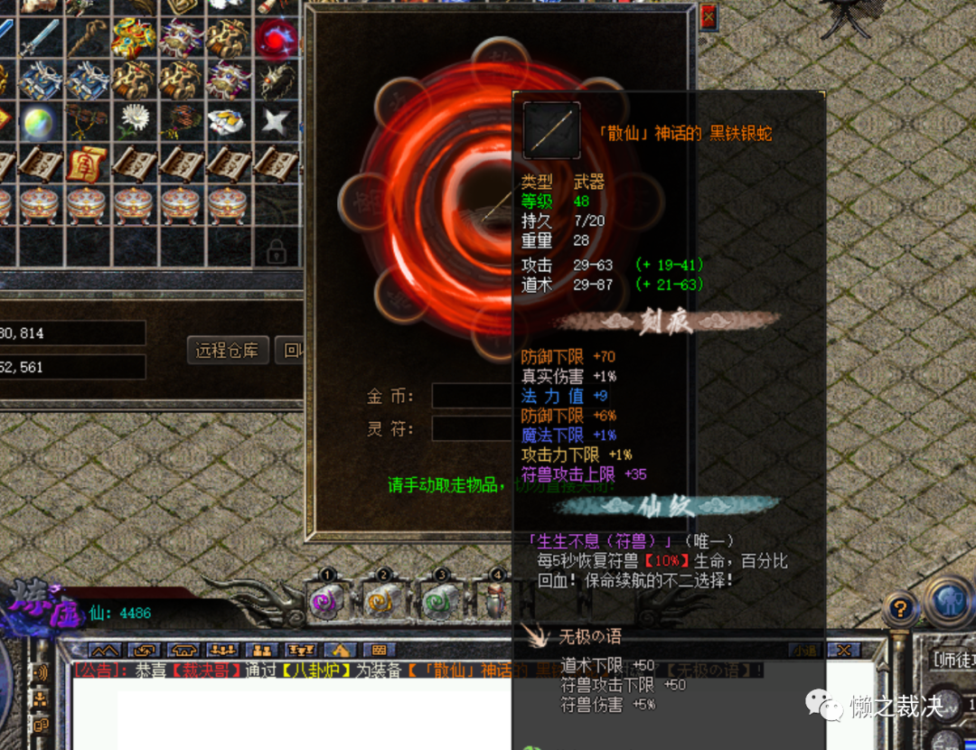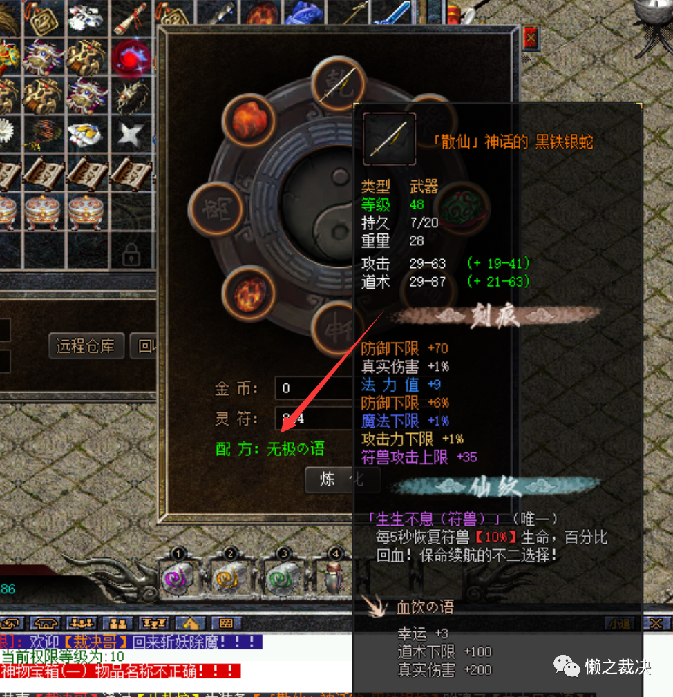 最后是【无极の语】:乾位:需要附魂的武器震位:祖玛の灵魂石兑位:血魔心脏坎位:恶魔の脑