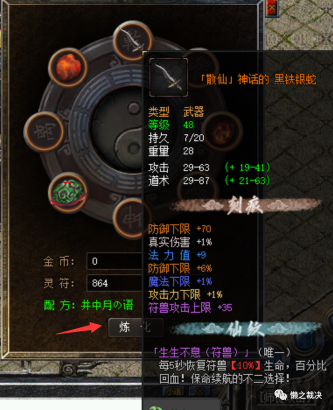 【井中月の语】炼器配方为:乾位:需要附魂的武器坎位:祖玛の灵魂石(祖玛蓝怪以上掉落)兑位:血魔心脏(赤月蓝怪以上掉落)震位:恶魔の脑(赤月蓝怪以上掉落)