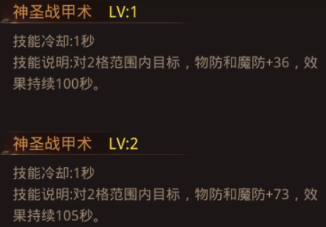 战甲术:对一定范围内的己方队友,增加一定物防和魔防,持续一定时间。随着技能等级的提高,增加战甲技能的防御效果和持续时间。