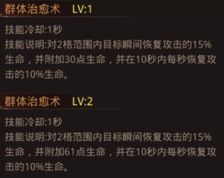 群体治愈术:对一定范围内的目标瞬间恢复等同于一定攻击百分比的生命值,并在随后的几秒内每秒恢复等同于一定攻击百分比的生命值(恢复的比例比瞬间恢复的少)