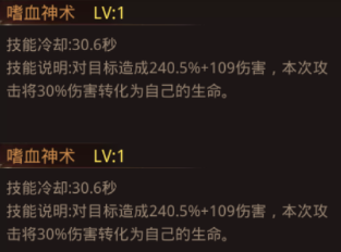 嗜血神术:对目标造成强力伤害,且将所造成伤害的30%转化为自己的生命