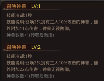 召唤神兽:召唤一定数量的神兽协助自身攻击敌人,且神兽无视敌人的防御,随着转职获得更多更强力的神兽。