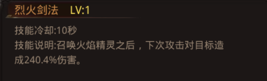 烈火剑法:召唤火焰精灵之后,下次攻击对目标造成292.5%伤害。(1级)