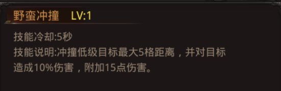 野蛮冲撞:冲撞低级目标最大5格距离, 并对目标造成10%伤害,附加1656点伤害。(1级)使目标定身1秒