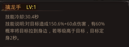 转职技能:擒龙手:对目标造成150.6%+60点伤害,有60%概率将目标拉到身边,若等级高于目标,目标定身2秒。(1级)