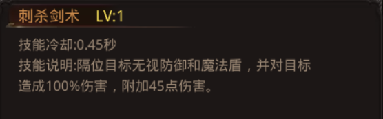 生命值较高,攻击强且防御也高,操作简单,非常适合新手战士技能刺杀剑术:隔位目标无视防御和魔法盾,并对目标造成伤害。