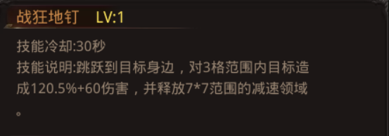 战狂地钉:跳跃到目标身边,对3格范围内目标造成120.5%+60伤害,并释放7* 7范围的减速领域。(1级)