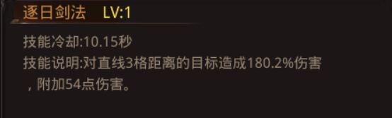 逐日剑法:对直线3格距离的目标造成207.2%伤害,附加6115点伤害。(1级)
