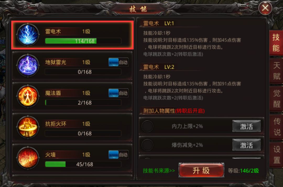 法师技能雷电术:对目标造成135%伤害,附加91点伤害,电球将跳跃2次对附近目标进行攻击。(1级)电球跳跃次数+2(转职后激活)