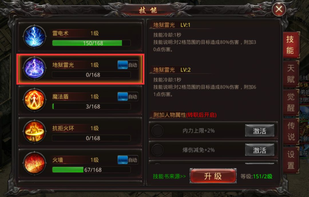 地狱雷光:对2格范围的目标造成80%伤害,附加30点伤害。(1级)