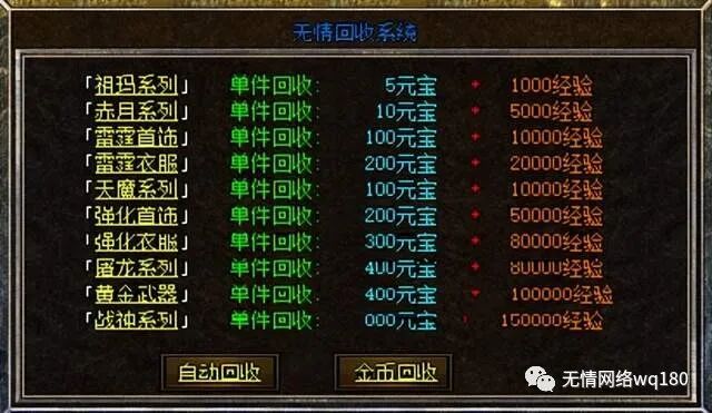 回收系统分为两个部分(1:元宝回收;2:金币回收)且可以自动回收地图