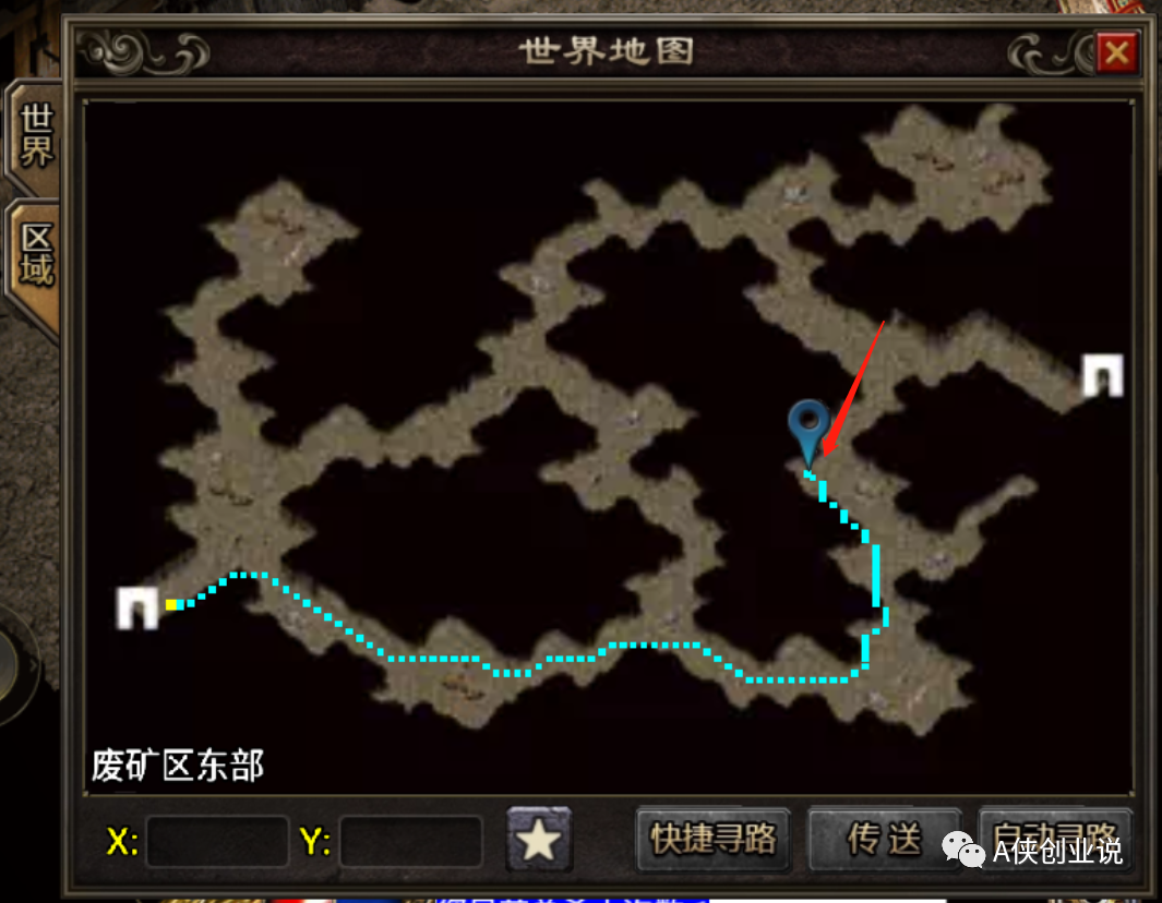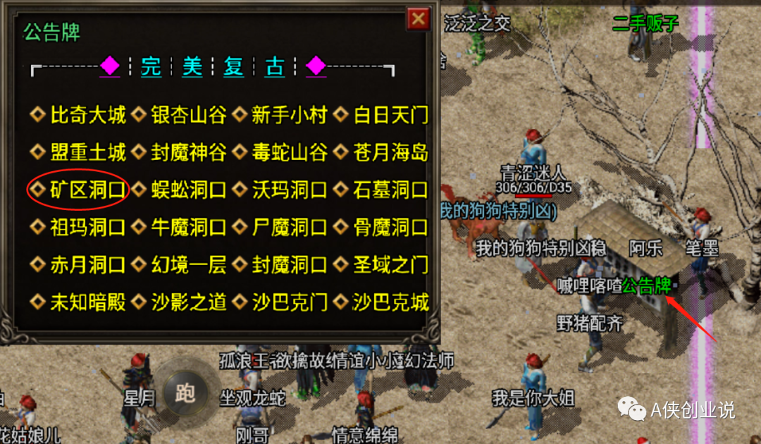 尸王在盟重公告牌,点开公告牌,点击矿区洞口,传送进去
